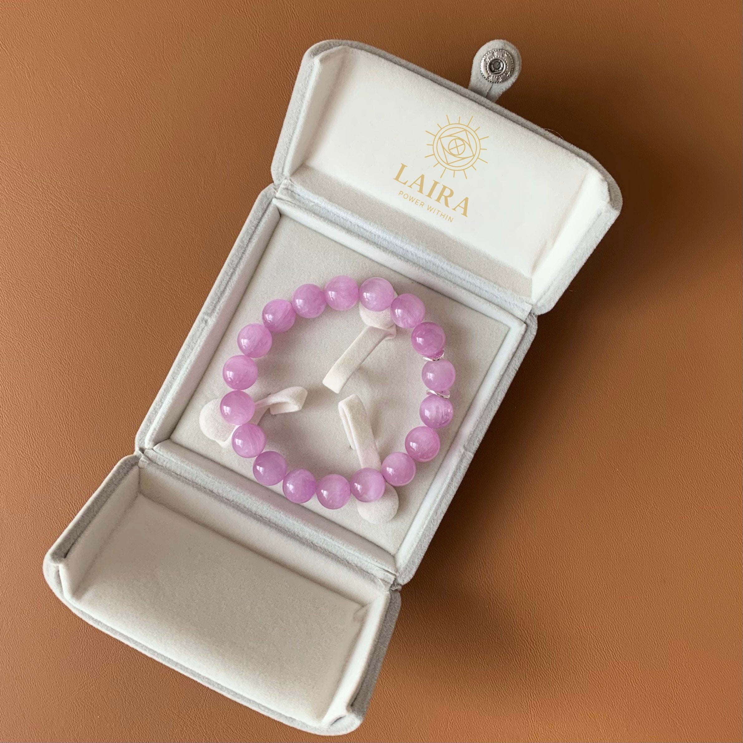 Each bracelet is crafted from natural lepidolite stones.